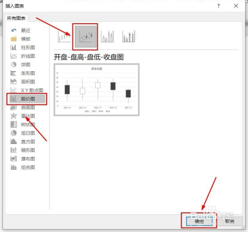点击“股价图”,点击“开盘-盘高-盘低-收盘图”,然后点击“确定”。