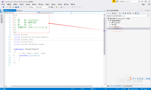 以办理员身份保留以上点窜内容,然后从头打开Visual Studio 2017,新建一个类或者接口,可以发现代码的注释模板内容已经主动加载到文件的顶部,如下图所示: