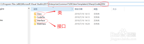 继续进入到目次位置C:\Program Files (x86)\Microsoft Visual Studio\2017\Enterprise\Common7\IDE\ItemTemplates\CSharp\Code\2052,可以发现下面有4个文件夹,别离是Class、CodeFile、Interface、WebClass,如下图所示:
