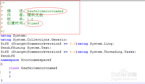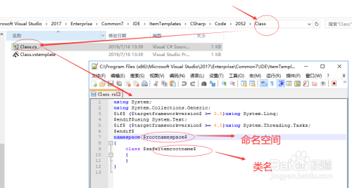 我们进入到Class目次中,里面包罗两个文件,别离是Class.cs和Class.vstemplate,我们用文本编纂器打开Class.cs文件,此中界说了定名空间和类名的占位符,如下图所示: