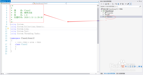 此时我们在类文件顶部添加我们的注释文件内容,好比描述、作者、版本和建立时候,这样就完当作了类文件的注释模板设置,如下图所示: