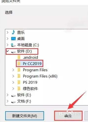 建议安装到除C盘以外的磁盘,可以在D盘或其他盘新建一个【Pr CC2019】文件夹,然后点击【确定】。
