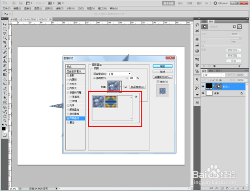 双击图示自界说图案图层,弹出图层样式设置栏。勾选【图案叠加】,点击图示小三角,弹出图案选项栏;