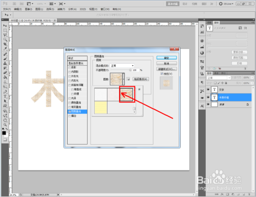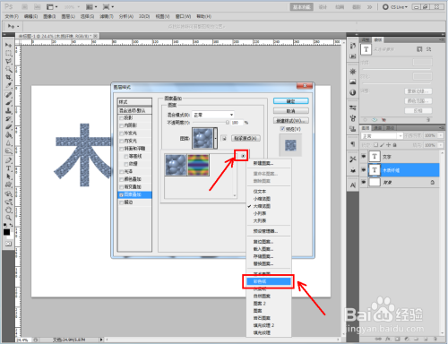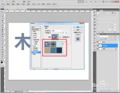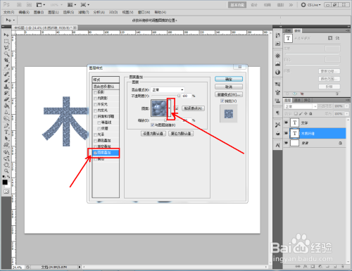 双击图示自界说图案图层,弹出图层样式设置栏。勾选【图案叠加】,点击图示小三角,弹出图案选项栏;