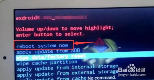 完当作用户数据清理和重置到出厂设置后,利用音量+/-键将光标移动到第一个菜单选项“reboot system now ”。