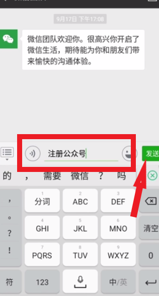 - 9点击“发送动静”,发送“注册公家号”。