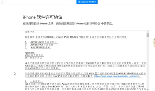- 4弹出“iPhone软件许可和谈”,我们勾选下方的我已经阅读并赞成”iPhone软件许可和谈“,再点击”继续“按钮。