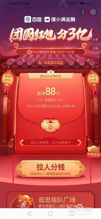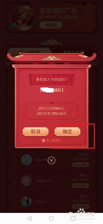 第二步进去之后,看到可以本身邀请老友组队瓜分红包,也可以直接插手别人战队瓜分红包,如下图所示: