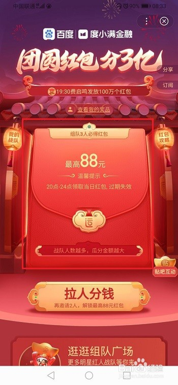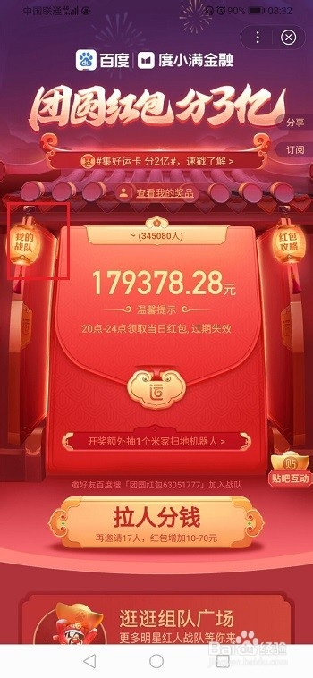 第一步进去2020百度瓜分红包界面,点击团聚红包分3亿,如下图所示: