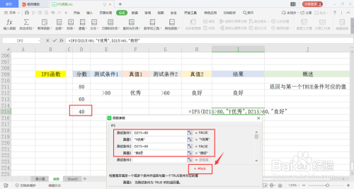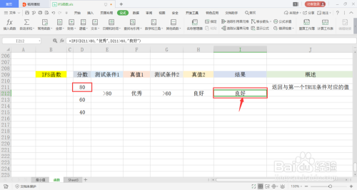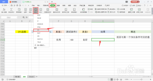 选中一个单位格用来存放输出成果,在菜单栏公式下,打开逻辑下拉框,点击此中的IFS函数。