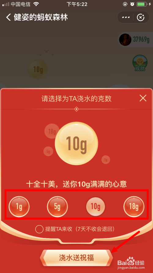 选择浇水的克数,再点击【浇水送祝福】。