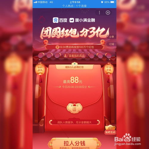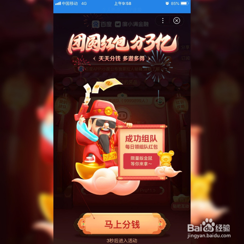 第一步打开百度APP,可以看到今天的团聚红包分三亿的活动已经起头了,点击下方的顿时分钱,如图所示: