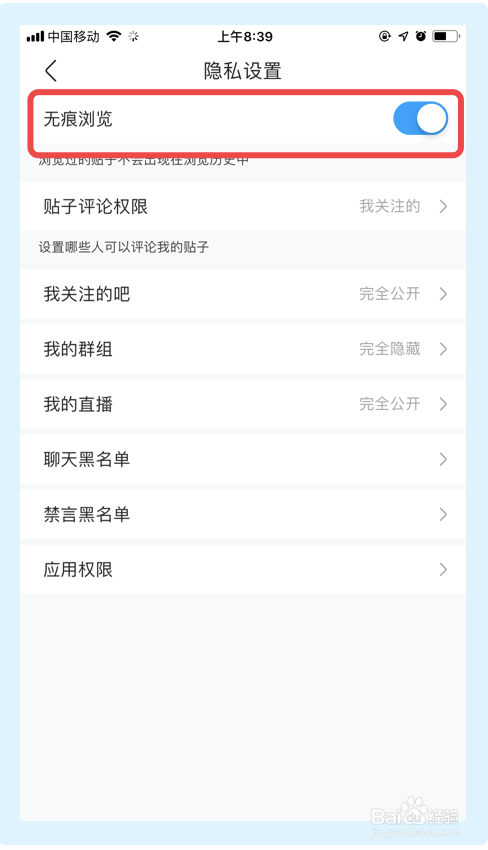 5.在【隐私设置】界面,点击【无痕浏览】,完当作以上步调百度贴吧app即可开启无痕浏览功能。