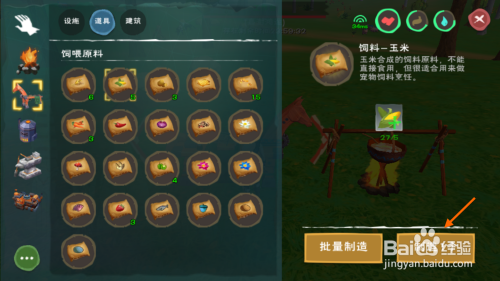打开工作台然后点击道具选项,别离将玉米和小麦建造当作饲料,每5个玉米可建造1份玉米饲料,每5个小麦可建造1份小麦资料。