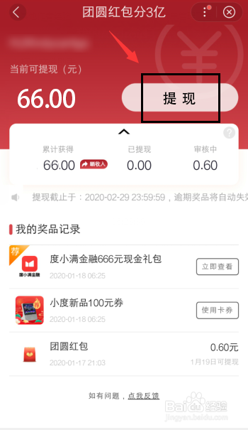 累计的红包经由过程实名绑定银行卡,24小时审核经由过程后,可以提现,提现日期最迟截止到2月29日,过期未提现,视为主动抛却奖励。
