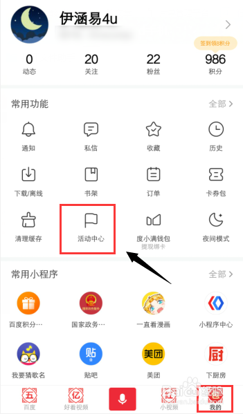 1、手机打开百度APP,登录百度账号,在我的页面,点击【活动中间】。