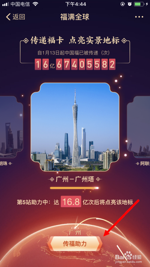 这样会进入【福满全球】的活动页面,点击【传福助力】。