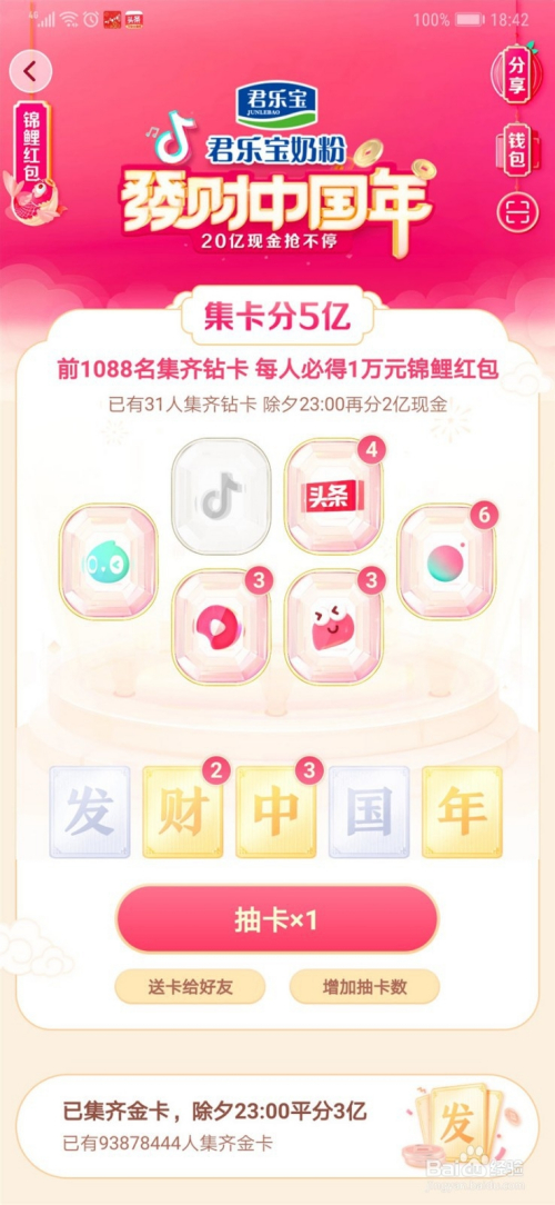 2.经由过程集齐抖音钻石卡获得锦鲤红包。
