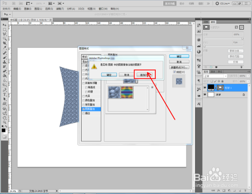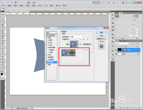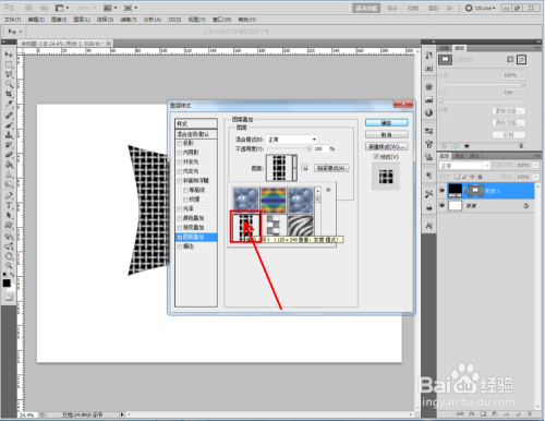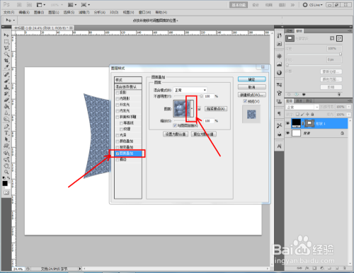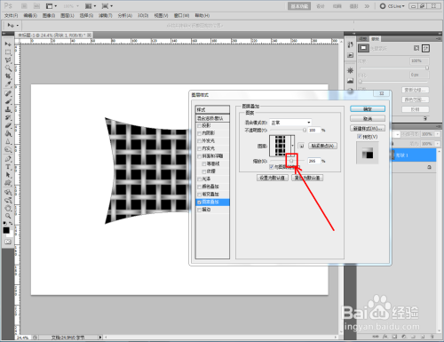 双击图示自界说图案图层,弹出图层样式设置栏。勾选【图案叠加】,点击图示小三角,弹出图案选项栏;