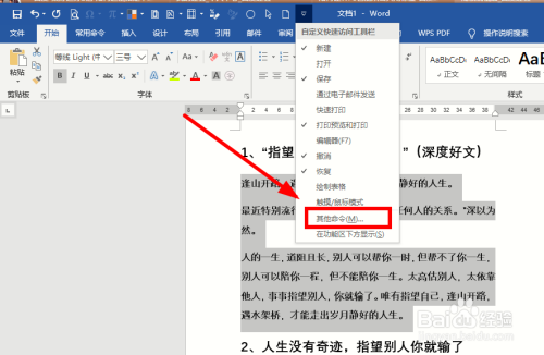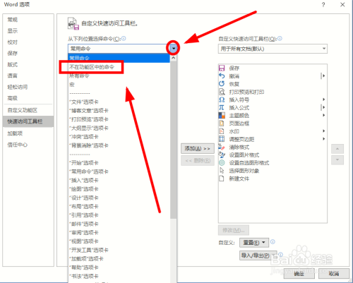 在弹出的Word选项对话框中,单击【下拉按钮】,选择下拉菜单中的【不再功能区的号令】单击