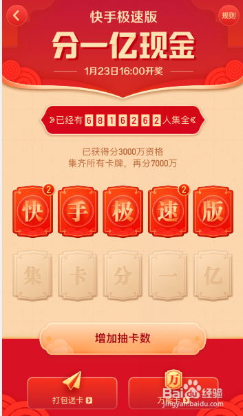 集齐“快手极速版集卡分一亿”10张卡片,就可以获得再分7000万的资格,也就是总共瓜分一亿。
