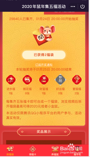 手机QQ2020鼠年集五福活动,每集齐五张福卡即可合当作一个福袋,拆开最高可得2020元或者小金鼠。