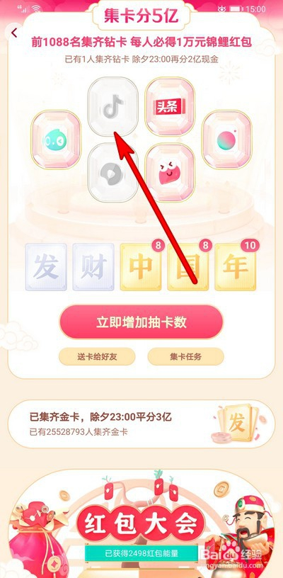 1、做使命获得抽卡次数,集齐金卡合当作钻卡随机获得抖音卡。