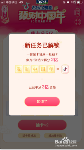 4、点击中心的“点击合当作”按钮,即可当作功解锁等分三亿的资格,接下来我们就可以来解锁钻卡,获取更高的红包瓜分资格。
