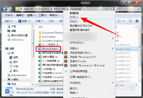 在打开的文件夹中,右键【Normal.dotm】文件,选择【打开】(不要双击直接打开)。