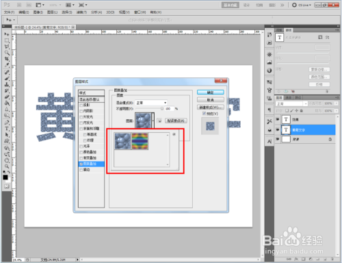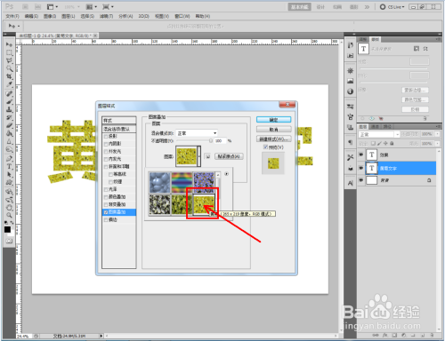 双击图示自界说图案图层,弹出图层样式设置栏。勾选【图案叠加】,点击图示小三角,弹出图案选项栏;