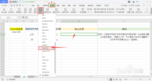 选中一个单位格用于存放输出成果,在菜单栏的公式下,打开文本下拉框,点击此中的SEARCHB函数。