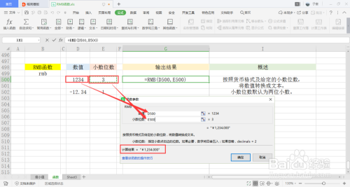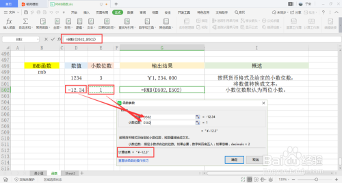 可以看到会弹出一个弹窗,里面有两个参数,别离是数值和小数位数,小数位数可以不填,默认是两位。可以手动输入,也可以鼠标选中单位格的内容引用。