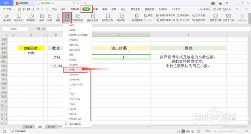 选中一个单位格用于存放输出成果,在菜单栏的公式下,打开文本下拉框,点击此中的RMB函数。