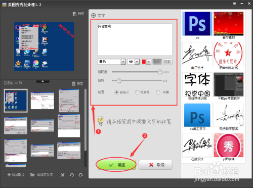 【4】在“文字”界面下,在文本框中输入所需要的文字,并设置字体、大小、颜色等等,之后点击“确定”按钮;