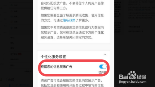 最后我们将页面下拉直到呈现如图所示界面,点击开关按钮,封闭按照您的信息展示告白