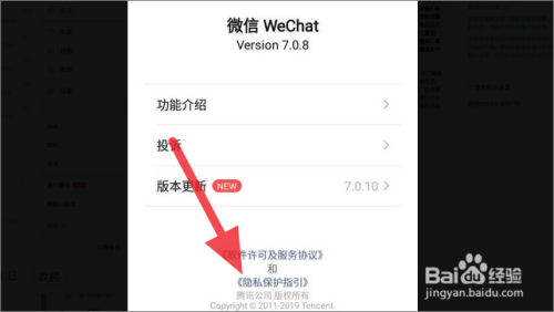 进入关于微信界面后,点击界面底部的【隐私庇护指引】
