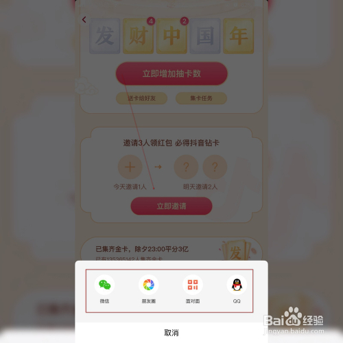 鄙人拉页面中,我们可以看到邀请老友领红包,必得抖音钻卡,只需邀请3小我就可以领取啦,如图所示: