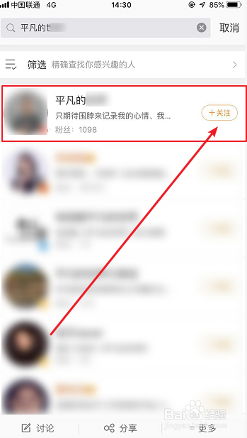 在搜刮出来的相关用户列内外,找到您要存眷的用户,点击【存眷】即可!