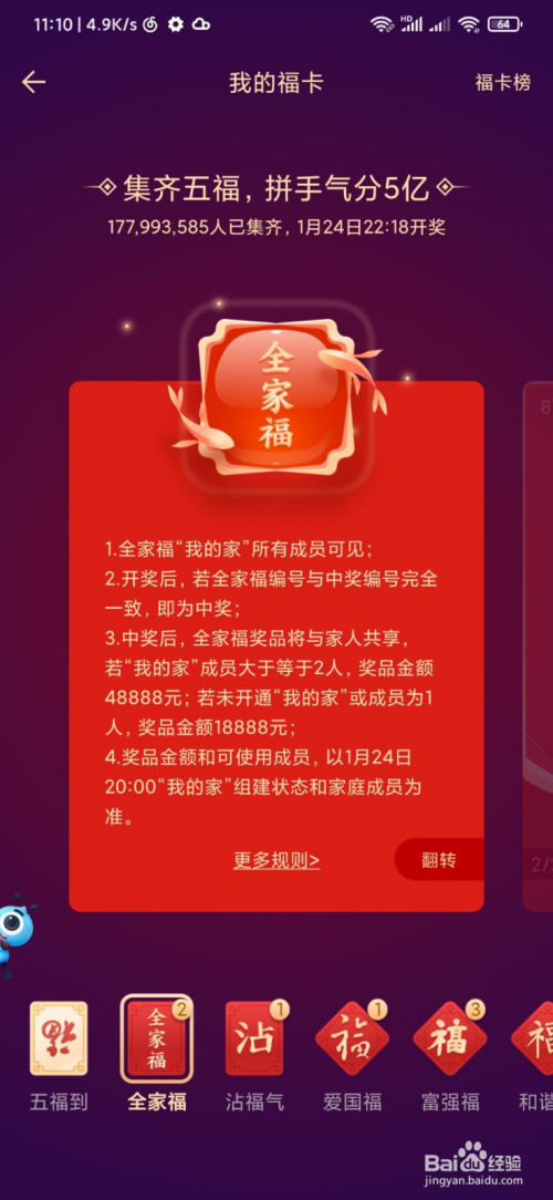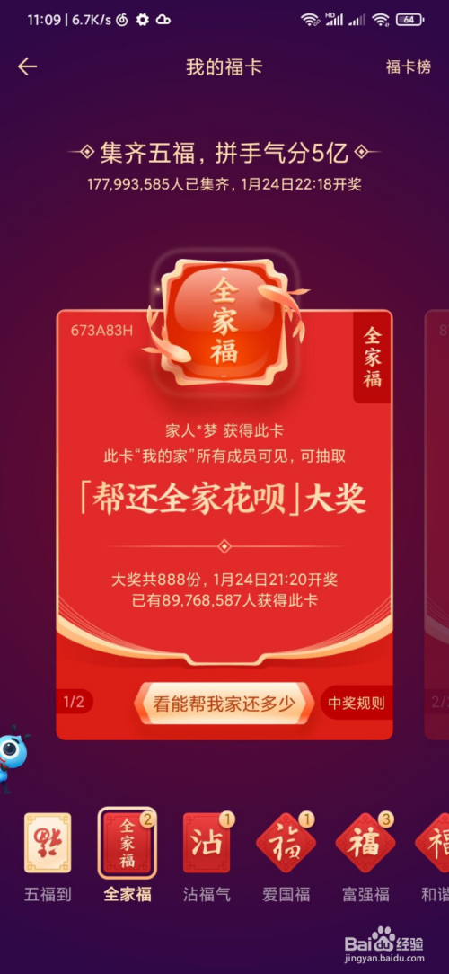 可以看到,当我的家里面有一小我有福卡之后,全家城市互得全家福。