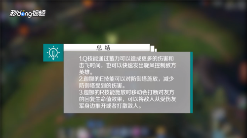 - 4迦娜的E技术是制造出一阵防御性的气旋,来为方针友军或防御塔接收即将到来的危险,并提高方针的进犯力。