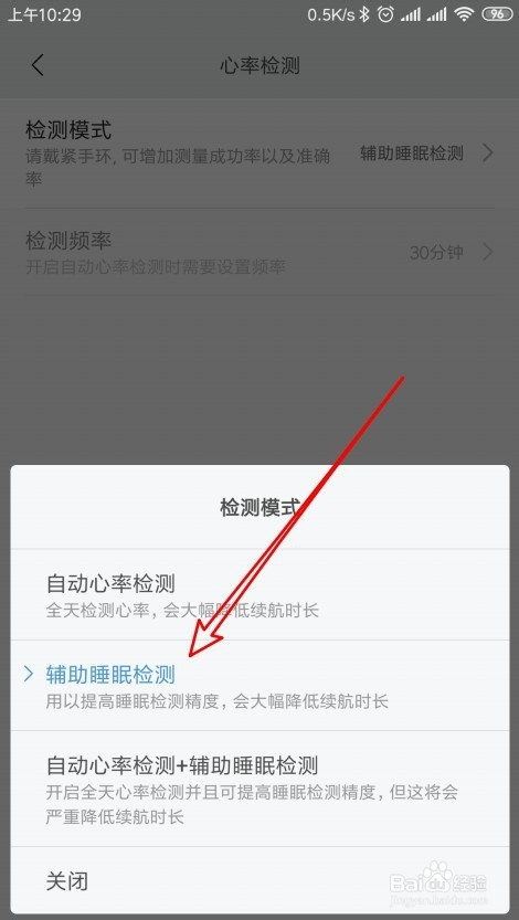 然后在弹出的下拉菜单中选中辅助睡眠检测的设置项即可。