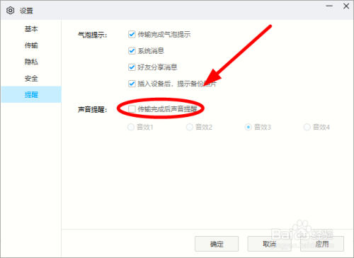 在右边窗口,选择【声音提醒】选项组中的【传输完当作后声音提醒】选项单击,去失落对该功能的勾选
