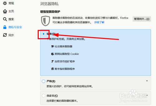 在右边窗口,找到【浏览器隐私】选项组下的【加强型跟踪庇护】,一般环境下我们选择【尺度】选项即可