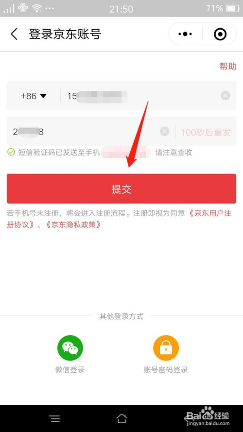 输入手机号码和短信收到的验证码,然后点击“提交”。