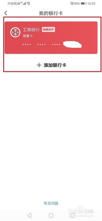 第二步进去常见问题之后,点击银行卡办理,如下图所示: