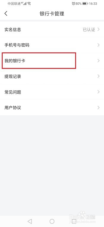 第四步进去我的银行卡界面,点击想要解绑的银行卡,如下图所示: