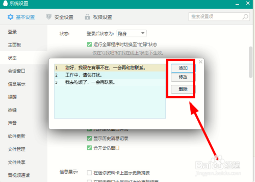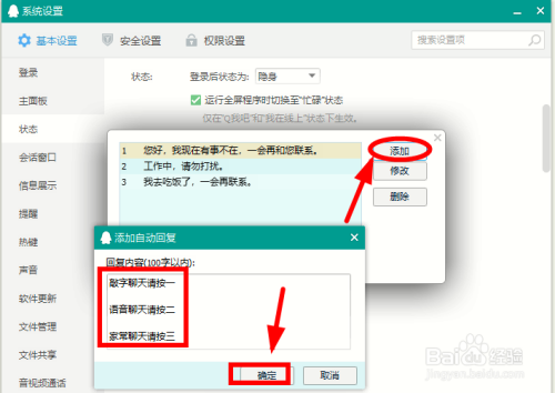这里单击【添加】,在输入框中输入答复内容后,单击【确定】后,封闭【主动答复设置】对话框即可