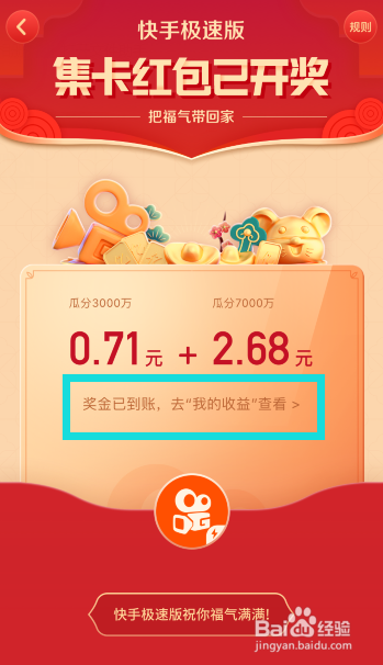 1、进入集卡活动页面,开奖获得奖励,点击“奖金已到账,去“我的收益”查看”