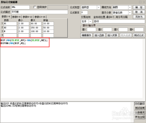 阐发股票软件中关于DMA指标的标识可以知道,该指标的DIF指数默认下由收盘价的10日简单移动平均指减去收盘价的50日简单移动平均得来,而DIFMA指数则是取DIF的10日移动平均值。