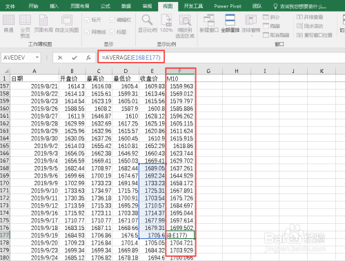 先增添后面一列用AVERAGE函数算出收盘价10日的平均值。